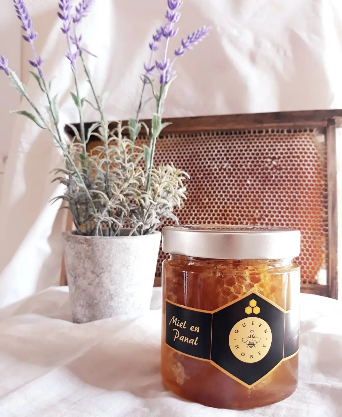 La miel en panal de Queen Honey es muy especial ya contiene en su interior un trocito de panal. Gracias a ello contiene muchísimas propiedades y concentra lo mejor de la colmena: jalea real, propóleo, cera y polen. Se puede probar de manera tradicional, o masticar directamente el panal, lo que intensifica su sabor.